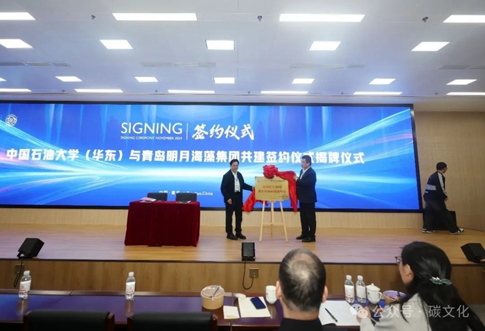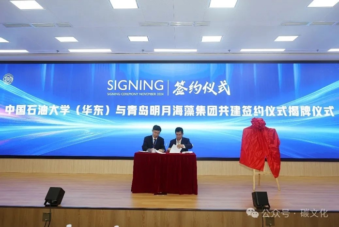協(xié)議包括三位一體協(xié)同創(chuàng)新中心建設(shè)(機(jī)構(gòu)建設(shè)、海洋碳匯教育、海洋碳匯科技和海洋碳匯人才建設(shè))及碳文化科普館建設(shè)兩大主要內(nèi)容,合同期三年,合作經(jīng)費(fèi)300萬元,主要基于明月海藻展館進(jìn)行海洋碳匯教育,接收學(xué)生研學(xué),并成立講解團(tuán),讓講解團(tuán)員在“講中學(xué)、學(xué)中講”;面向?qū)W生設(shè)立海洋碳匯科研項(xiàng)目,鼓勵(lì)學(xué)校教師參與公司科研研發(fā)和校企共同申請(qǐng)?zhí)紖R科技項(xiàng)目;建立海洋碳匯人才庫(kù),并對(duì)優(yōu)秀人才給予一定的獎(jiǎng)勵(lì);在校內(nèi)建立“碳文化館”,并由校企雙方選派指導(dǎo)教師,利用碳文化相關(guān)課程進(jìn)行科普創(chuàng)作等,致力于為教育、科技、人才服務(wù)。中國(guó)工程院院士孫金聲與集團(tuán)有限公司副總裁張德蒙共同為共建中心揭牌,孫金聲院士向張德蒙副總裁頒發(fā)中心首席科學(xué)家聘書。山東省石油高校石油工程碳中和協(xié)同創(chuàng)新主任張衛(wèi)東教授與青島明月海藻集團(tuán)有限公司科技創(chuàng)新部經(jīng)理張宗培共同為碳文化公眾號(hào)啟用揭牌。